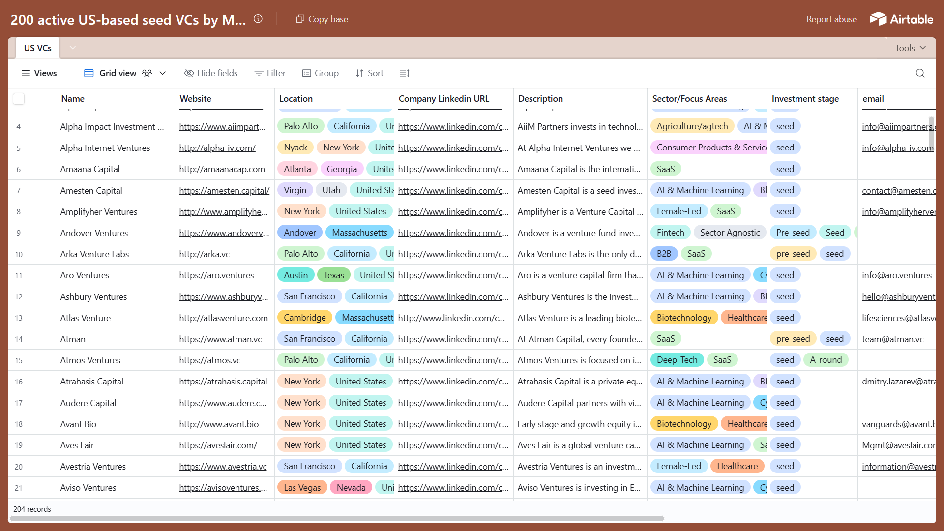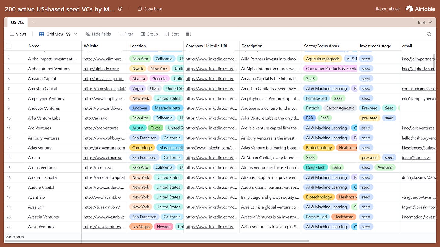 The data includes their website, location, LinkedIn company page (use that to find the relevant decision makers on LinkedIn, where you can reach out to them directly, in person), description/thesis, preferred domains and sectors, and a contact email.